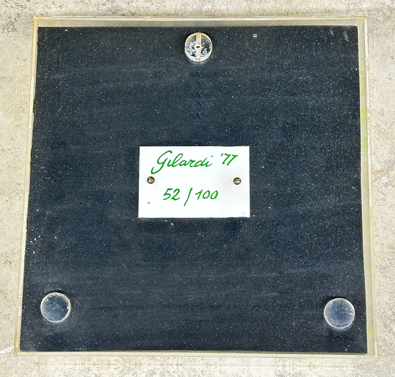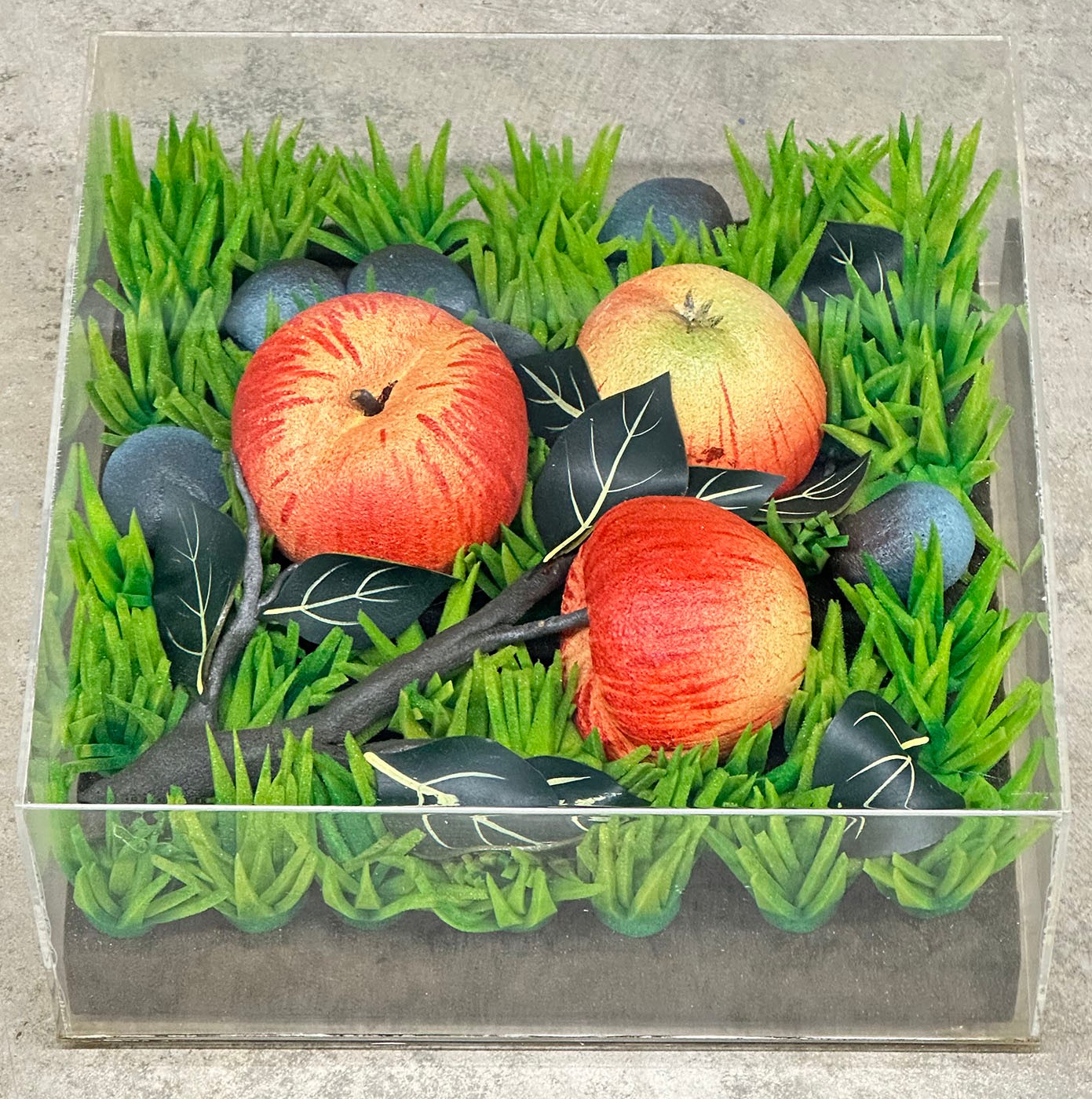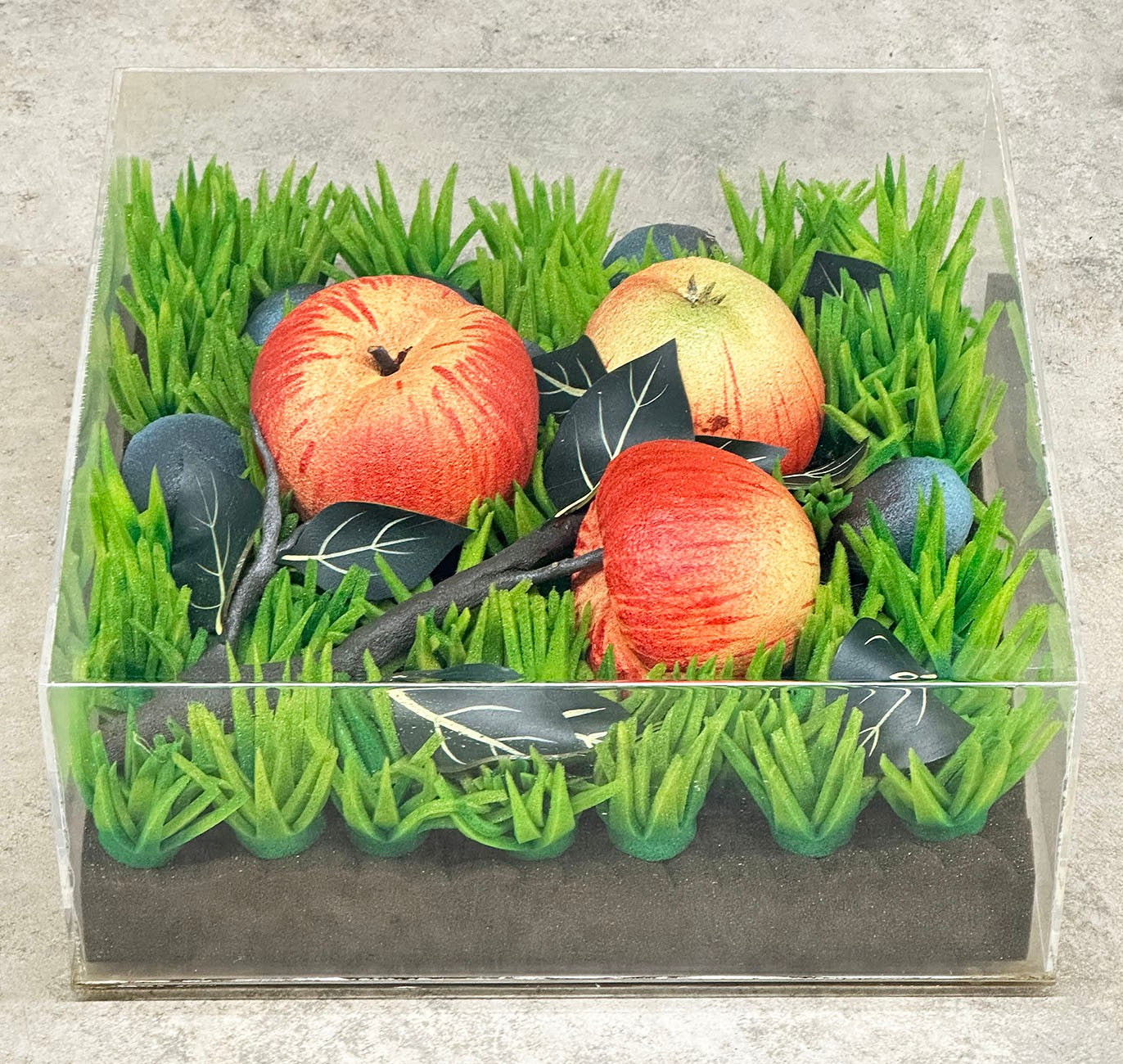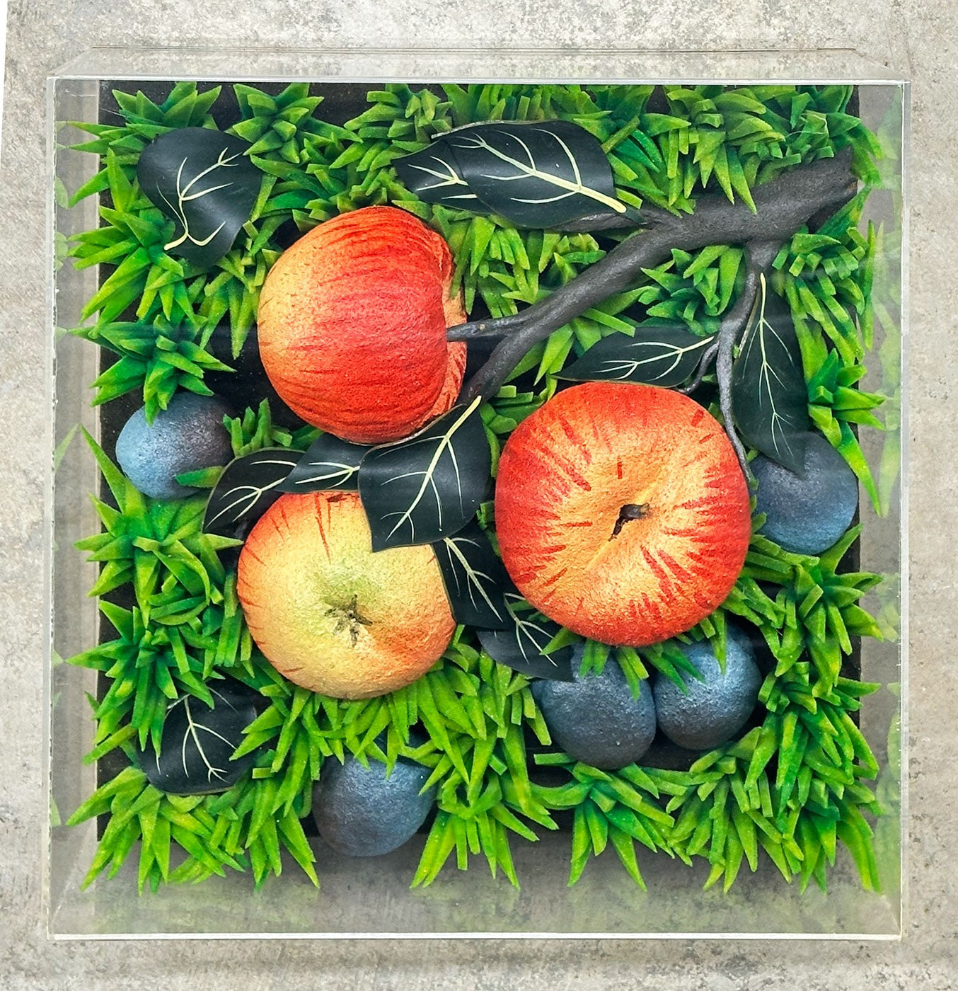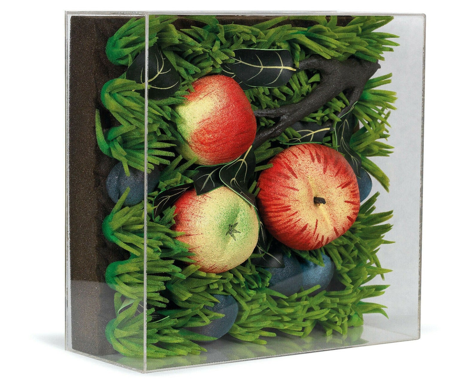 Executed in foam rubber and presented in a plexiglass case, this editioned work embodies Gilardi’s exploration of artificial nature—hyper-real yet synthetic, tactile yet conceptual. The apples, rendered in foam, simulate organic decay while remaining industrial in material, challenging perception and material authenticity.